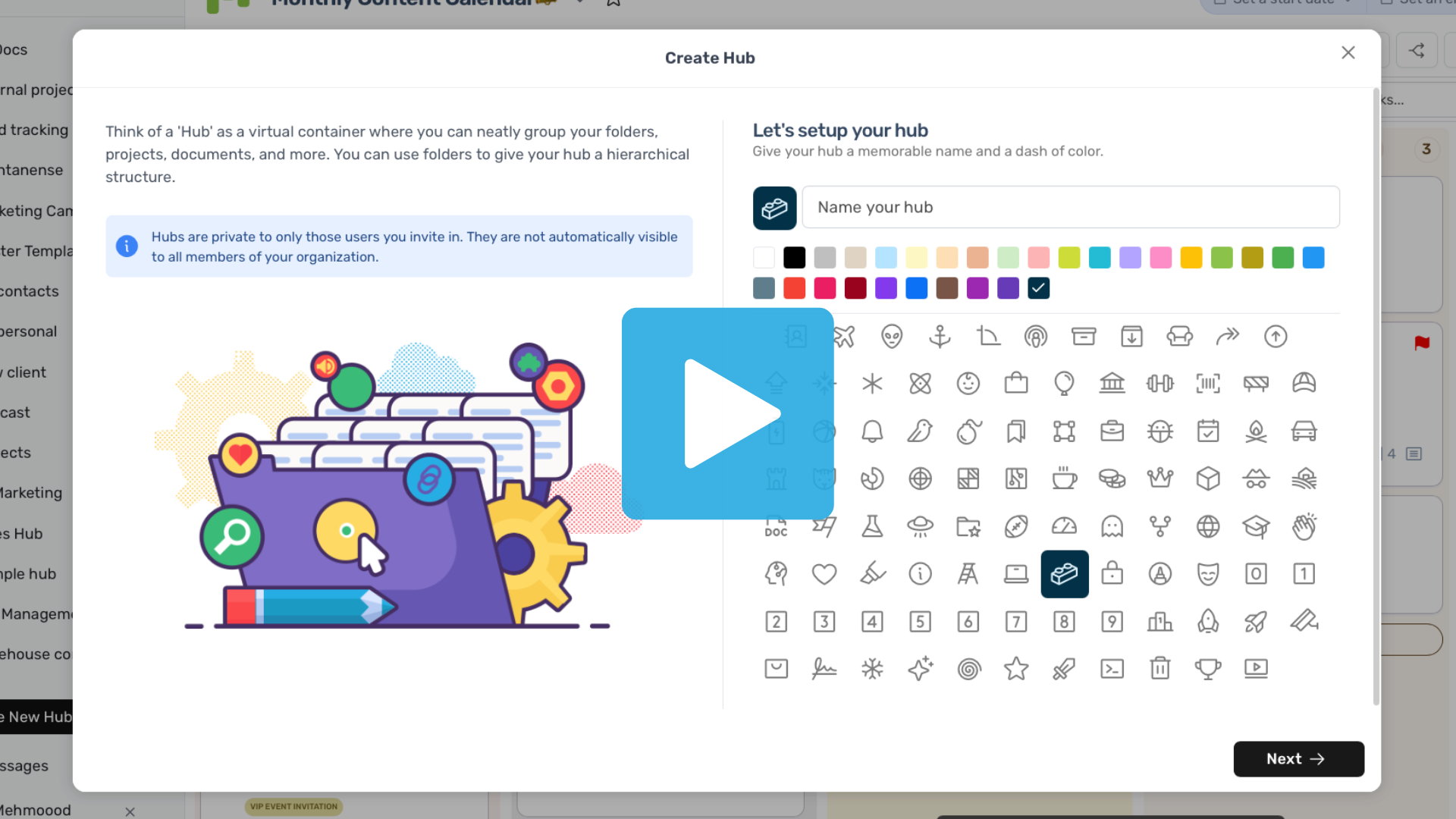 Create a new hub, set your workspace details, and organize your team in just a few clicks.